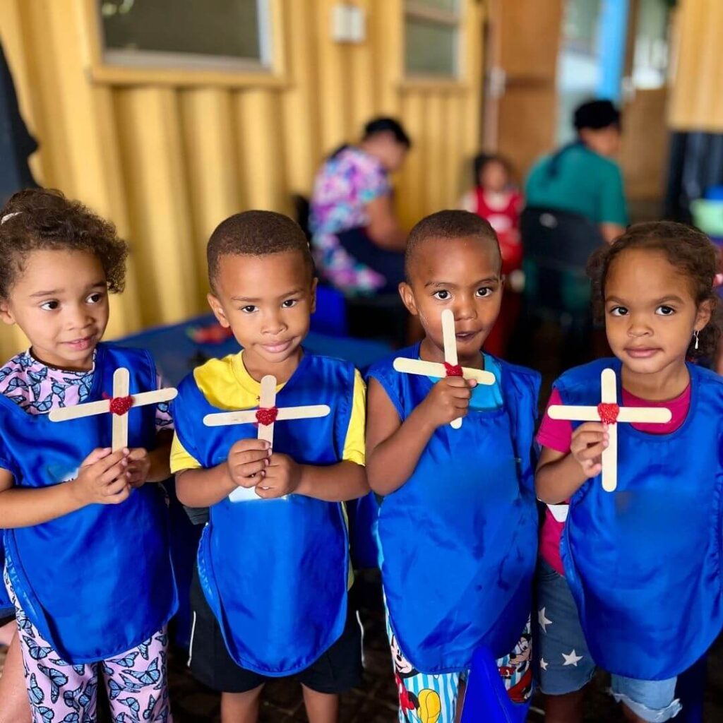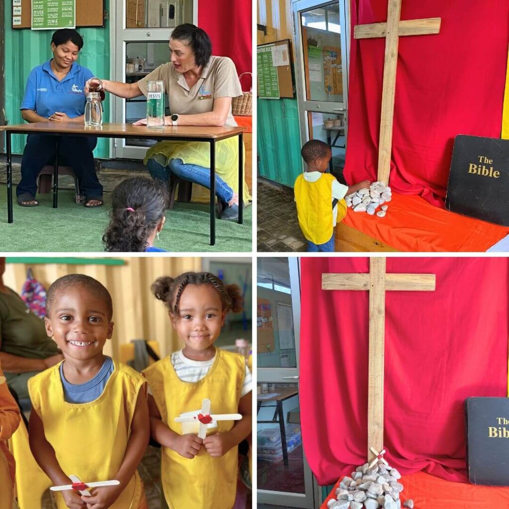 Each child made their own cross with red yarn representing Jesus’ blood, sealed with a heart to understand His love. Each child also received a second cross to take home, with the message: